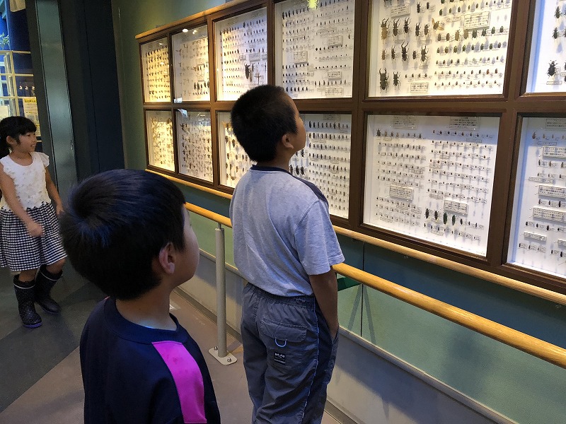 昆虫標本の前で立ち止まり真剣に見入っていました。